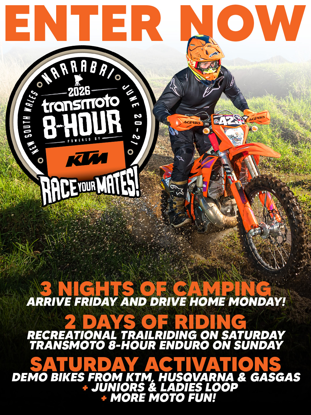 Enter before 6pm AEST on Friday, April 10, and you’ll automatically go in the draw to WIN a FREE team entry (worth up to $1800) into the 2026 Transmoto 12-Hour at Batemans Bay (Oct 24-25).